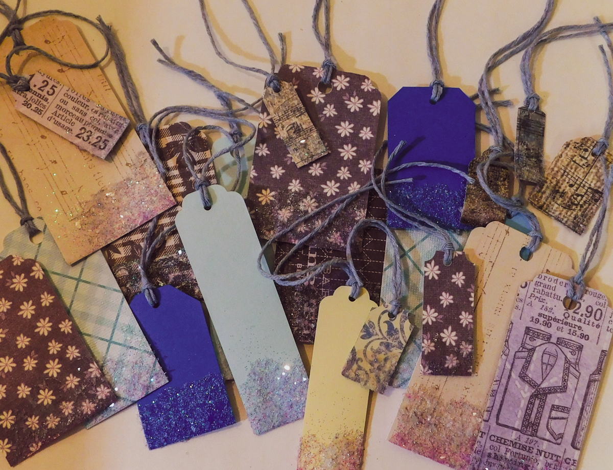 Simply create your tag top, apply glue in a random swish across the bottom of your tag, front and back, dip into your glitter and allow to dry. Layer your tags if desired, add a string and use for gifts or decorations.