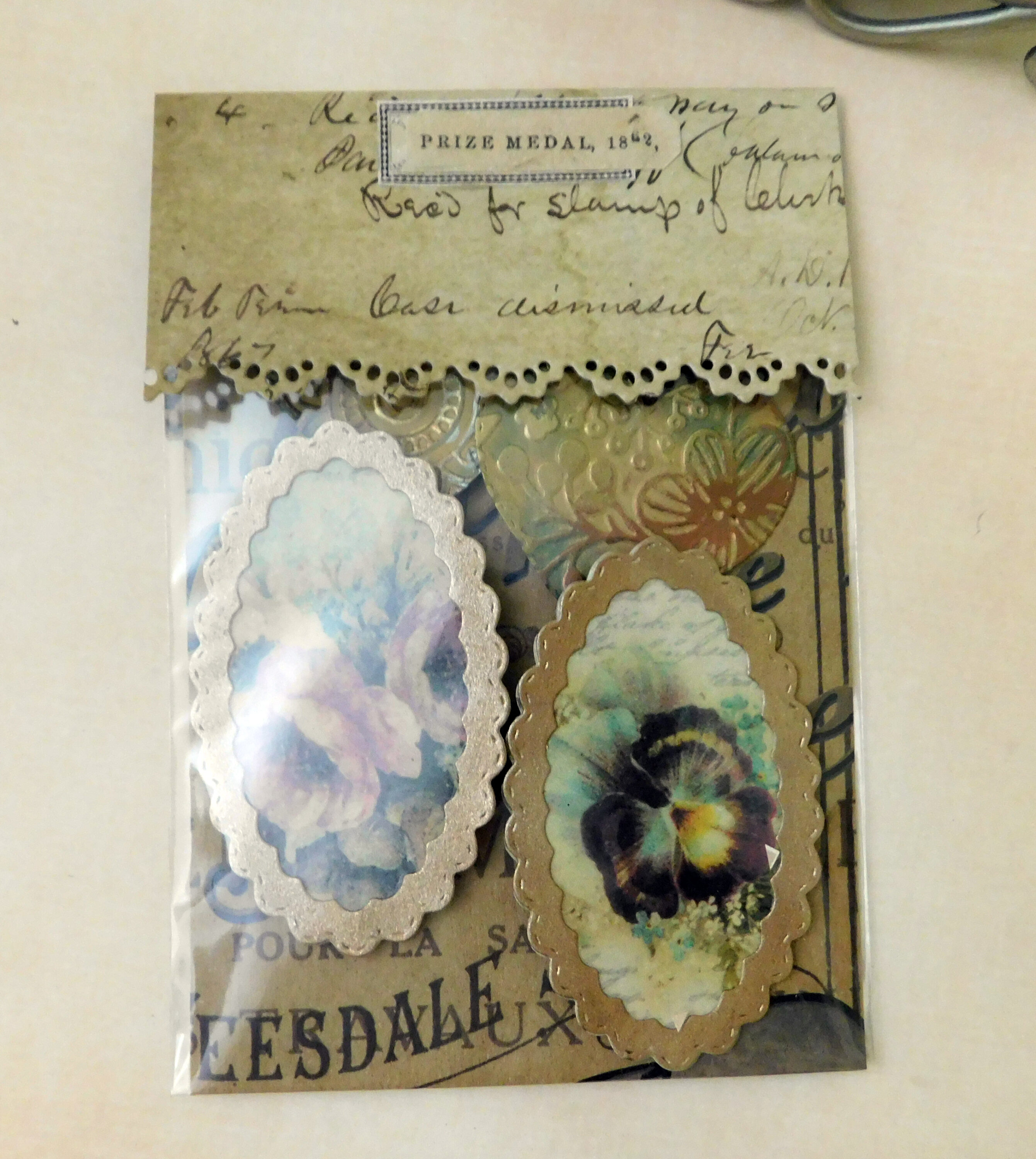 I then went on to create a variety of stickers as shown in the photo at right using digital paper ephemera Vintage Butterflies and scrap book paper and my wax vellum technique shown here…. and here…