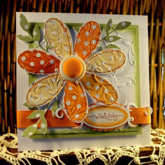 I was happy to try out my new daisy die and I used my mandala type embossing folder which always reminds me of the sixties. A geometric background adds a touch of a sixties style and the colors were decided by the card stock and what neutrals I have in store.